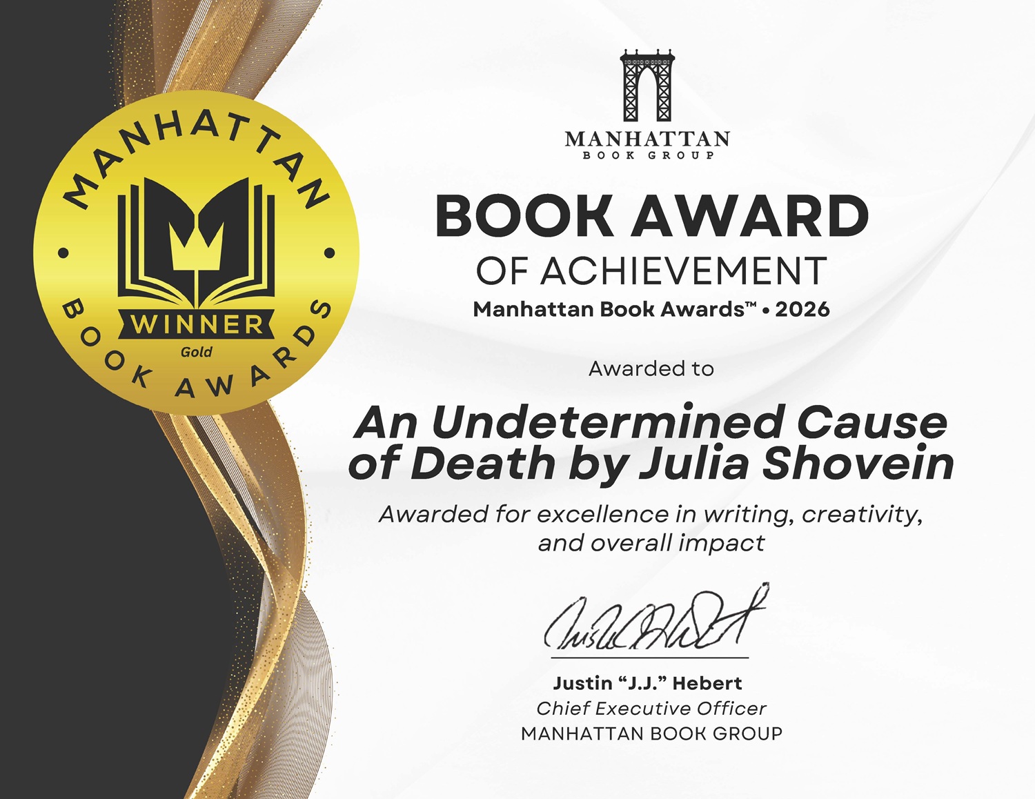 Manhattan Book Group proudly announces that “An Undetermined Cause of Death: Sailing Mystery Book 3” by Julia Shovein has been awarded Gold in the 2026 Manhattan Book Awards. The honor recognizes exceptional storytelling, originality, and imaginative scope in contemporary publishing.
